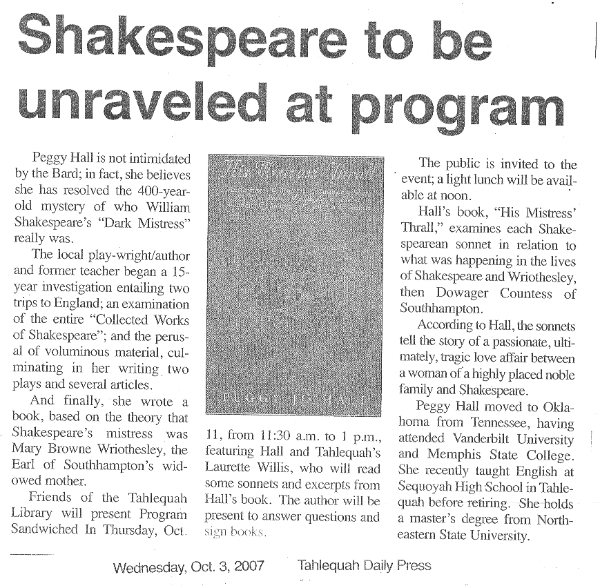 - Hall, Peggy Jo - His Mistress' Thrall: An Account of William Shakespeare’s Love Affair with Mary Browne Wriothesley, the Earl of Southampton’s Mother, as Revealed in the Sonnets